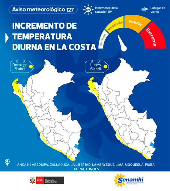 Según el aviso meteorológico N° 127, con nivel de alerta amarillo, se prevén temperaturas máximas entre 30°C y 36 °C en la costa norte, entre 29°C a 31 °C en la costa centro y entre 29 °C y 34 °C en la costa sur.