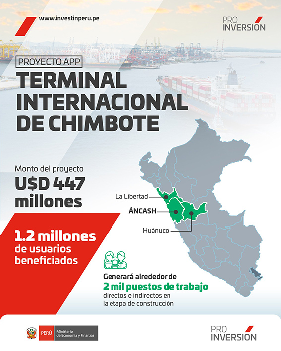 La Agencia de Promoción de Inversiones del estado Proinversión, ha dado a conocer en sus redes sociales que la inversión en el Terminal Portuario de Chimbote será de 446 millones de dólares y que su adjudicación será en el segundo trimestre de este año 2026.