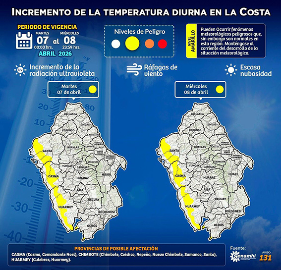 El Centro de Operaciones de Emergencia Regional (COER) Áncash informó que entre el 7 y 8 de abril se registrará un incremento de la temperatura diurna, de ligera a moderada intensidad, en la zona costera de la región.