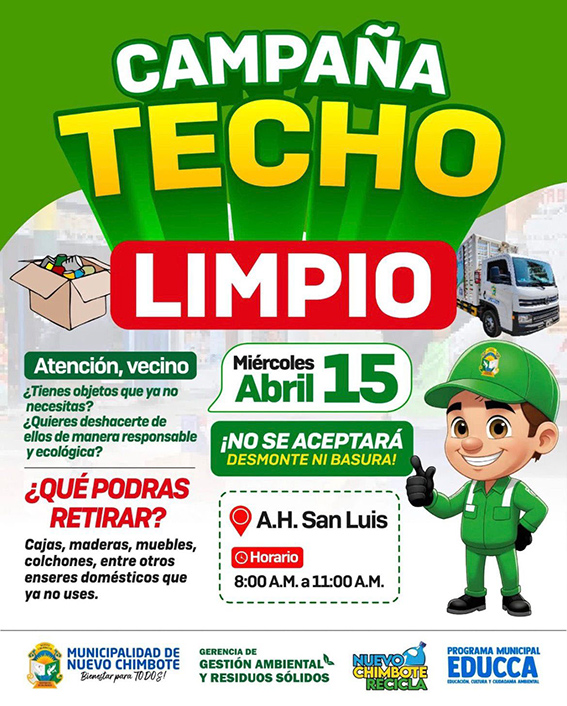 Con el objetivo de promover un distrito más limpio y ordenado, la Municipalidad de Nuevo Chimbote anunció la realización de la campaña “Techo Limpio” en el asentamiento humano San Luis.