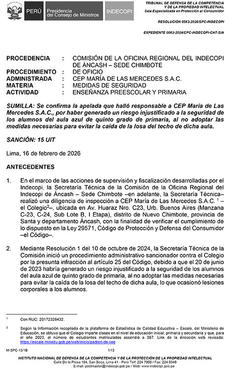 Lima, 16 de febrero de 2026. El Indecopi confirmó una multa de 15 UIT contra el colegio CEP María de Las Mercedes S.A.C., en Nuevo Chimbote, por poner en riesgo la seguridad de sus alumnos tras la caída de una losa del techo en un aula de primaria.