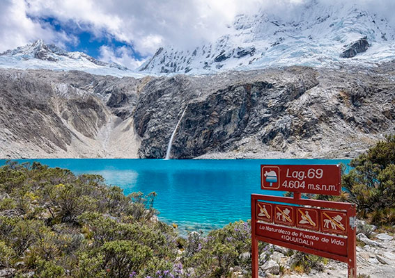 Situado a 4,604 metros sobre el nivel del mar en la Cordillera Blanca, la Laguna 69 se ha convertido en un destino obligado para miles de turistas amantes de los deportes de aventura. La laguna es famosa por sus aguas turquesas intensas y su paisaje nevado.