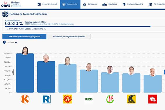 Al 63.31% de las actas contabilizadas por la ONPE, en la elección presidencial, la progresión se mantiene es decir en el primer lugar Keiko Fujimori, en segundo Rafael López Aliaga y en el tercer lugar Jorge Nieto Montesinos.