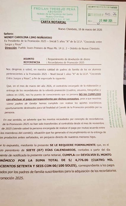 Finalmente, se informó que la carta notarial cuenta con la firma de los padres de familia afectados, quienes respaldan el documento y reiteran su pedido de devolución del dinero destinado para un recuerdo de esta etapa de sus menores hijos.