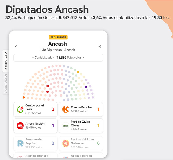 Según esta misma fuente al 43.600% de las actas contabilizadas Juntos Por el Perú pondría dos diputados, a pesar que existe la presencia de Beto Ugarte de País Para Todos que en el recuento de votos de Onpe tiene 6,242 votos. Es decir, es el candidato mas votado, pero hasta el momento su agrupación política no pasa la valla electoral.