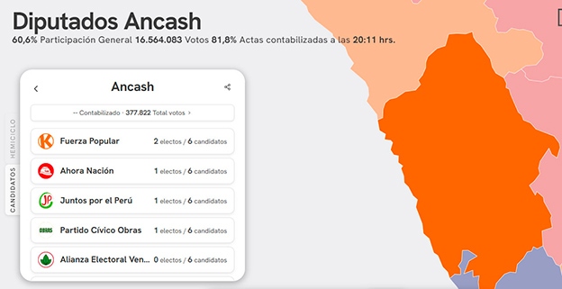 Hasta anoche se sigue confirmando que fuerza popular colocara dos diputas de acuerdo al conteo oficial de ONPE, pues en la región Áncash tiene 53 mil 113 voto y juntos por el Perú 52,935 votos. En el tercer lugar se encuentra País Para Todos con 36 mil 372 votos, pero como a nivel nacional no alcanza cupo para el senado nacional no tendrá representantes en el parlamento.