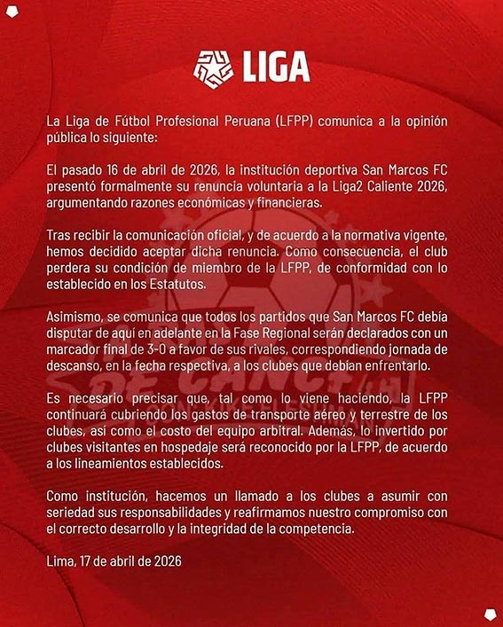El pasado 16 de abril de 2026, la institución deportiva San Marcos FC presentó formalmente su renuncia voluntaria a la Liga2 Caliente 2026, argumentando razones económicas y financieras, dice el comunicado.