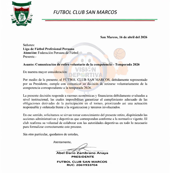 “Por medio de la presente, el Fútbol Club San Marcos, debidamente representado por su presidente, comunica su decisión de retirarse voluntariamente de la competencia correspondiente a la temporada 2026”, se lee en el documento.