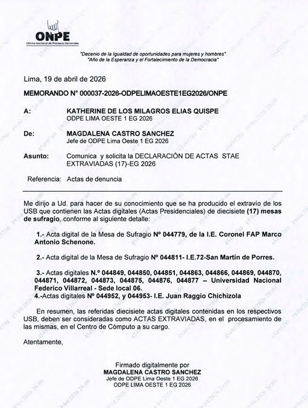 Un memorando de la Oficina Nacional de Procesos Electorales (ONPE) da cuenta del extravío de dispositivos USB que contenían actas digitales correspondientes a 17 mesas de sufragio en el marco de las Elecciones Generales 2026. El documento solicita que dichas actas sean consideradas como «extraviadas» durante el procesamiento en el centro de cómputo.