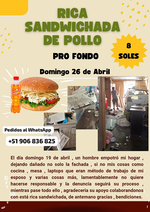 La iniciativa se llevará a cabo este domingo 26 de abril, ofreciendo la venta de sandwich de pollo a un precio de 8 soles. A través de esta actividad solidaria buscan cubrir parte de los gastos y recuperar lo perdido.