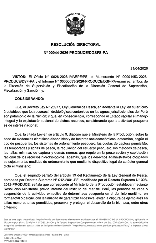 En ese contexto, PRODUCE dispuso la paralización de las actividades extractivas del recurso anchoveta (Engraulis ringens) y anchoveta blanca (Anchoa nasus) por un periodo de 15 días calendario, desde las 00:00 horas del 22 de abril hasta las 23:59 horas del 6 de mayo de 2026.